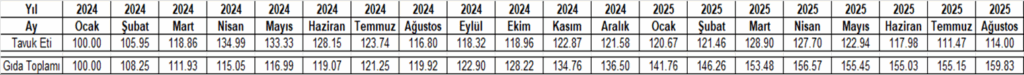 TÜİK verilerine atıfta bulunulan açıklamada, Ocak 2024 – Ağustos 2025 döneminde gıda enflasyonunun yüzde 59,83 olarak gerçekleştiği, buna karşılık piliç eti fiyat artışının yüzde 14 seviyesinde kaldığı açıklandı.